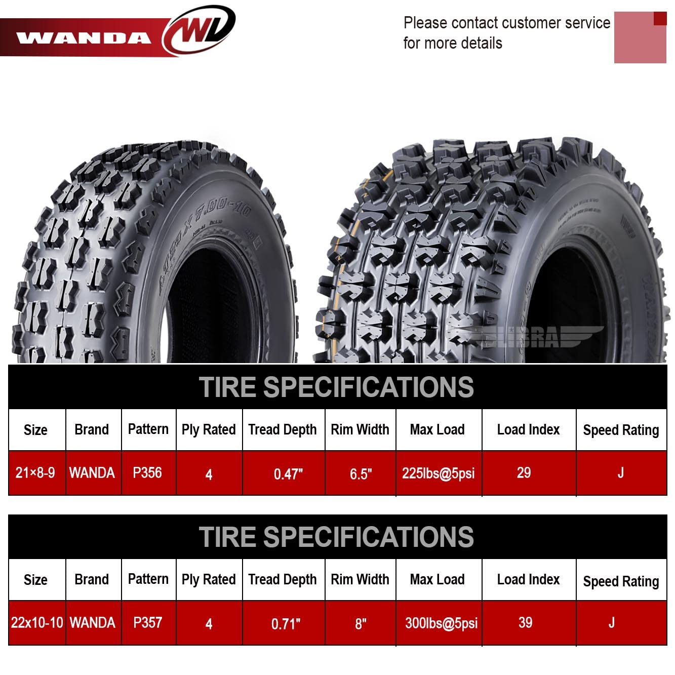 - 4 Ply, load range B, 21x8.00-9 (Rim Width: 6.5", 265lbs@5psi), 22x10.00-10 (Rim Width: 8", 350lbs@5psi),